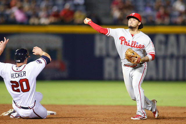 Phillies shortstop Freddy Galvis (13) turns a double play against