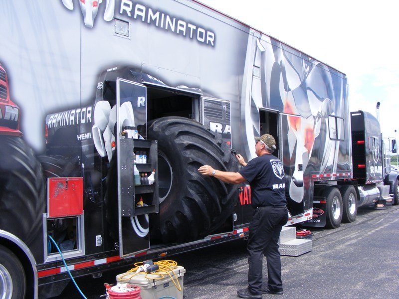 To get the larger than life pick-up truck inside a regular sized semi-trailer, it must be transported with regular size mud tires mounted. Therefore, the first order of business of Friday morning was to get the "little" tires off and mount the large ones that make the monster mean and impressive.