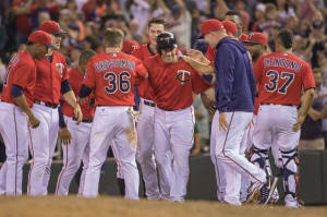 Twins first baseman Joe Mauer (7) gets congratulated by teammates