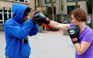 Inside the gym, the muted thud of leather gloves striking punchbags