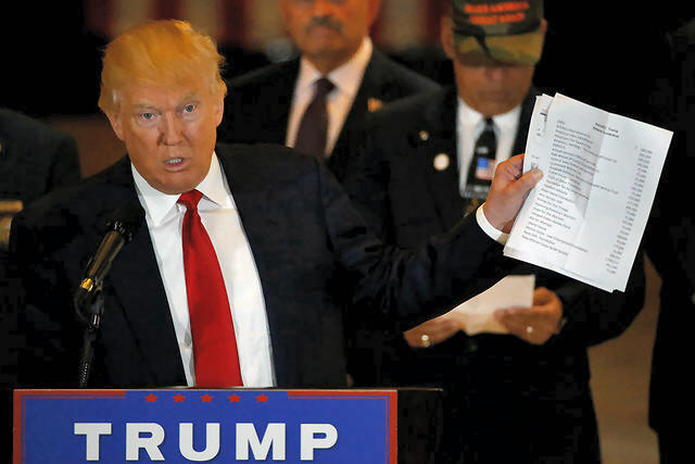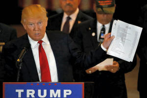 Republican presidential candidate Donald Trump holds up a list of