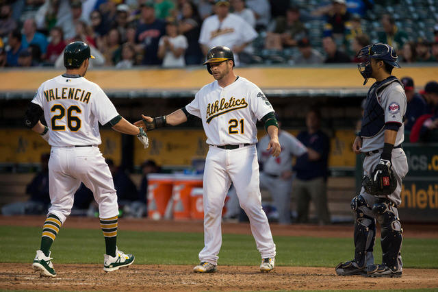 Athletics third baseman Danny Valencia (26) is greeted by catcher