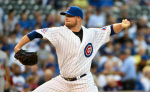 Cubs starting pitcher Jon Lester (34) throws against the Los Angeles