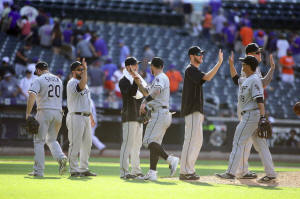The Chicago White Sox celebrate after defeating the New York Mets at
