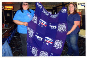 - Kathleen Brumbaugh shows one of the Survivors Quilts she created
