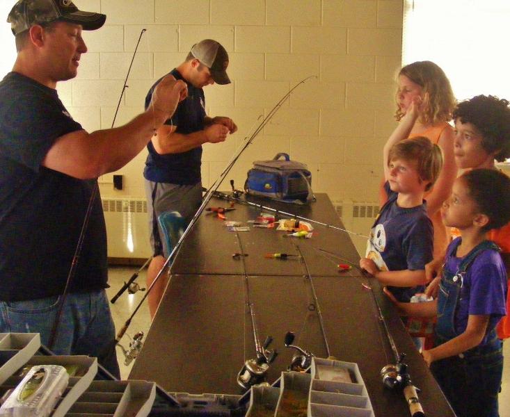 in rapt attention demonstrating the attachment of fishing tackle and