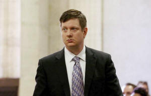 Chicago police Officer Jason Van Dyke approaches the bench during