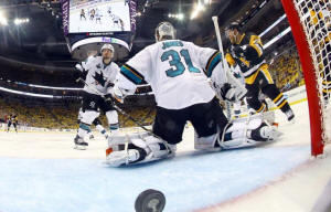 after the game-winning goal by Conor Sheary (not pictured) past San