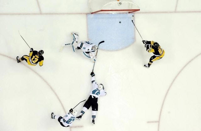 Phil Kessel (81) who scores a goal past San Jose Sharks