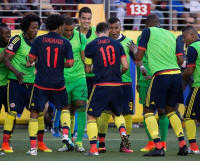Colombia midfielder James Rodriguez (10) celebrates by dancing