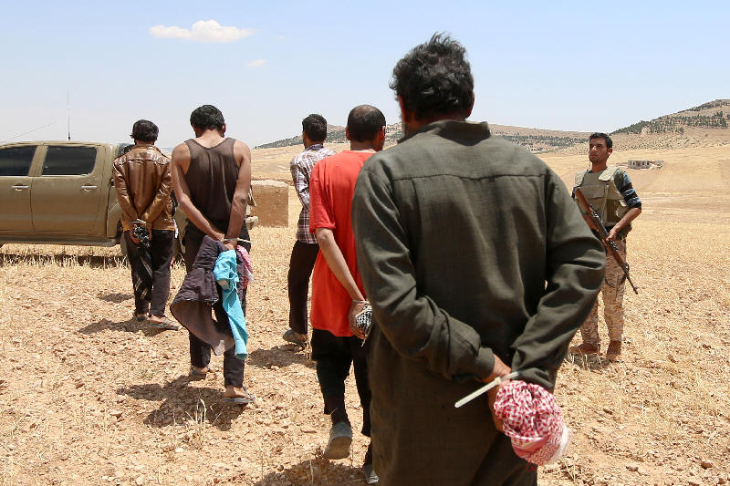 Islamic State fighters, walk as they are taken prisoners