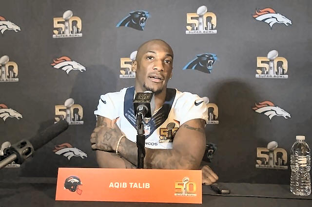 Aqib Talib (21) addresses the media during a press conference