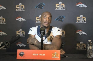 Broncos cornerback Aqib Talib (21) addresses the media during a