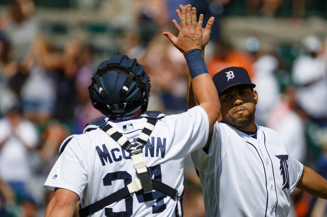 Tigers catcher James McCann (34) and relief pitcher Francisco