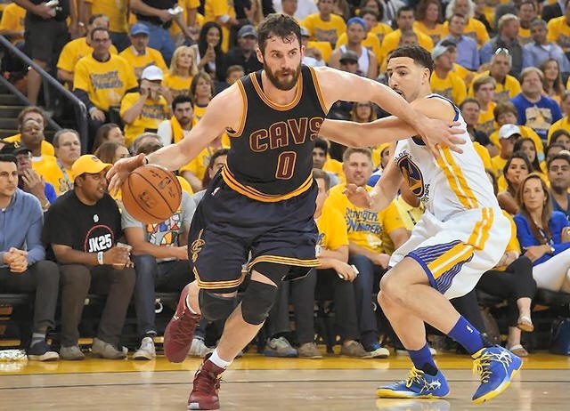 Cavaliers forward Kevin Love (0) moves the ball against Golden