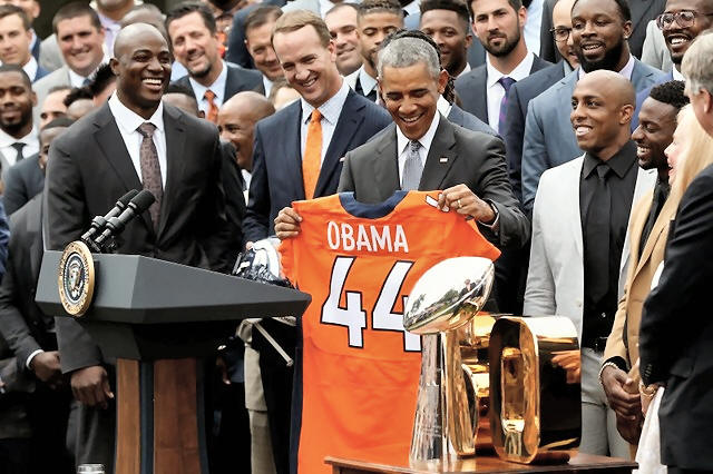 Peyton Manning (second left) look on as President Barack Obama