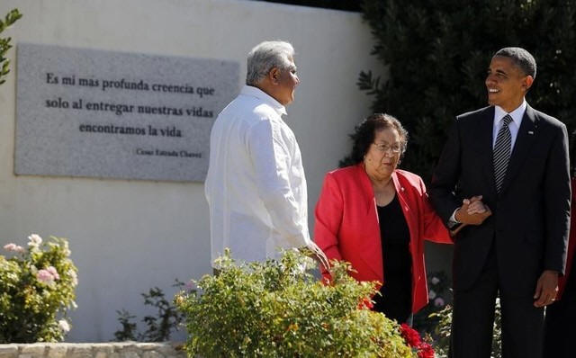 National Monument walking with the widow of Chavez, Helen F. Chavez (C),