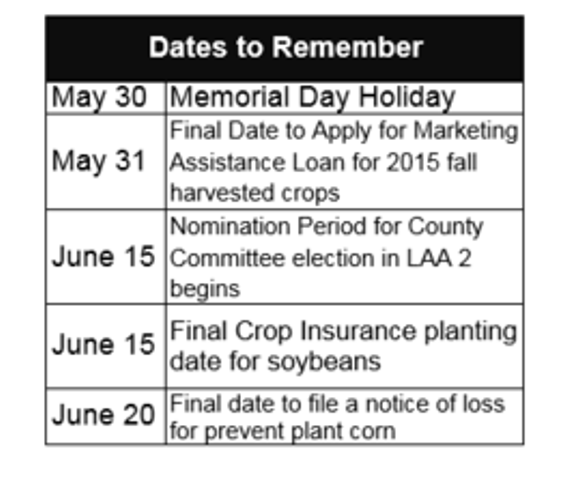 All producers are encouraged to contact their local FSA office for more information on the final planting date for specific crops. The final planting dates vary by crop, planting period and county so please contact your local FSA office for a list of county-specific planting deadlines. The timely planting of a crop, by the final planting date, may prevent loss of program benefits.