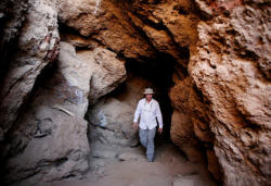 Geologist Leonard Karr walks out from an old mine in the Eastern