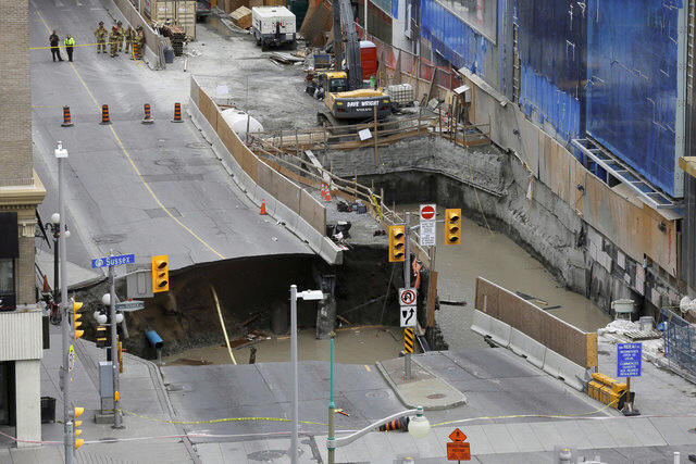 Emergency workers look at a large sinkhole in Ottawa, Ontario,