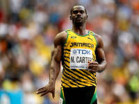 Nesta Carter of Jamaica reacts after winning his men's 100
