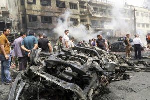 People gather at the site of car bomb attack in Baghdad al-Jadeeda,
