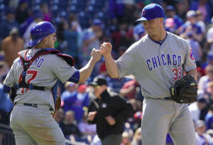 Cubs catcher Miguel Montero (47) and relief pitcher Clayton Richard