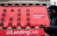 woman looks at her phone as she passes by a Lending Club banner