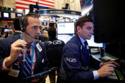 Traders work on the floor of the New York Stock Exchange in New