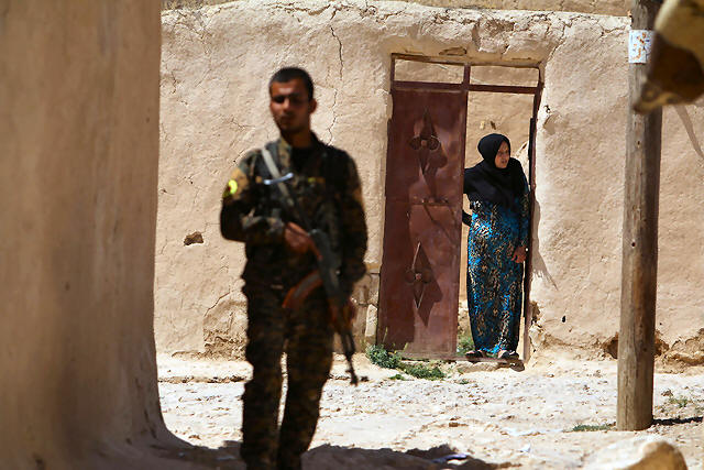 A Syria Democratic Forces (SDF) fighter stands near a woman looking