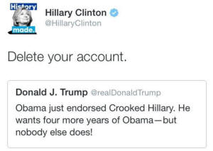 to tweet back: "Obama just endorsed Crooked Hillary. He wants