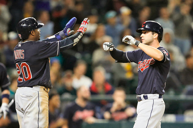 Rajai Davis (20) celebrates with center fielder Tyler Naquin (30)