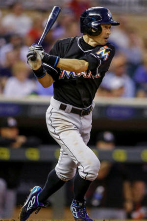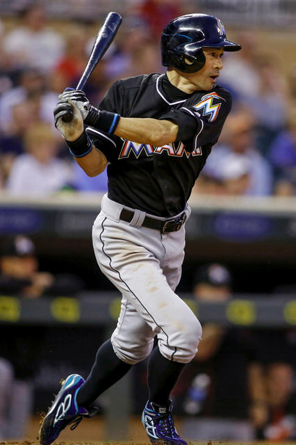 Marlins right fielder Ichiro Suzuki (51) hits an RBI single against