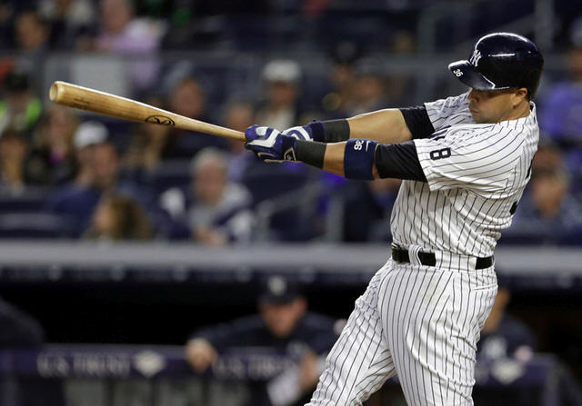 Yankees right fielder Carlos Beltran (36) hits a two-RBI double