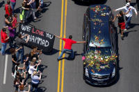 A man reaches out to touch the hearse carrying the body of