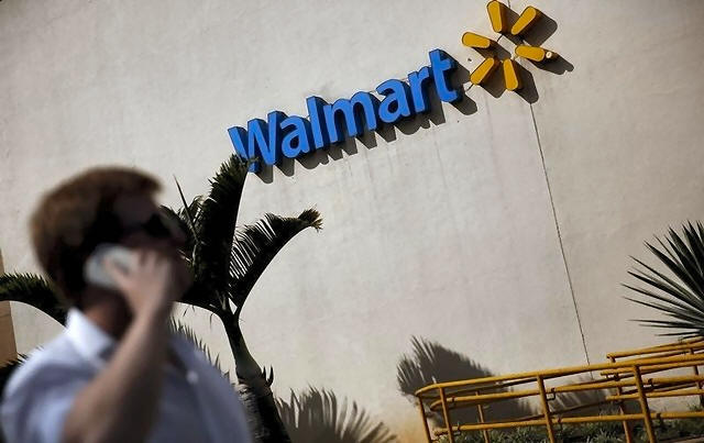A man talks on his mobile phone in front of a Wal-Mart store in