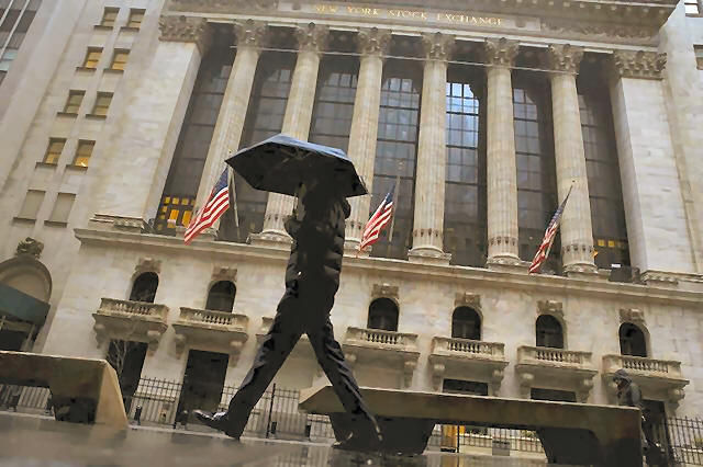 A man passes by the New York Stock Exchange during a rain storm