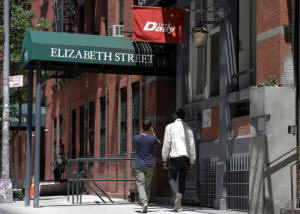 People walk past a building that lists offices for Gawker Media in