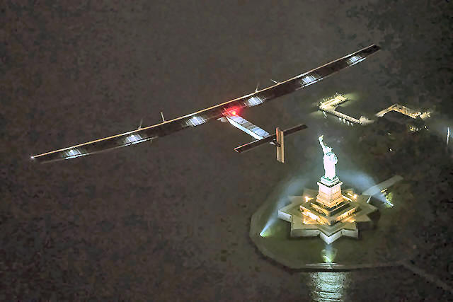 Andre Borschberg, flies over the Statue of Libery in in New York,