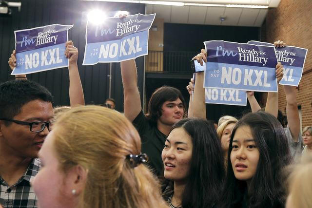 Audience members hold signs reading "No KXL," referring to the