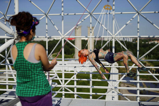 Zorana Unkovic (L), 27, holds a rope for Kaitlin, 28, from the