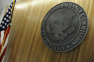 The seal of the U.S. Securities and Exchange Commission hangs on the