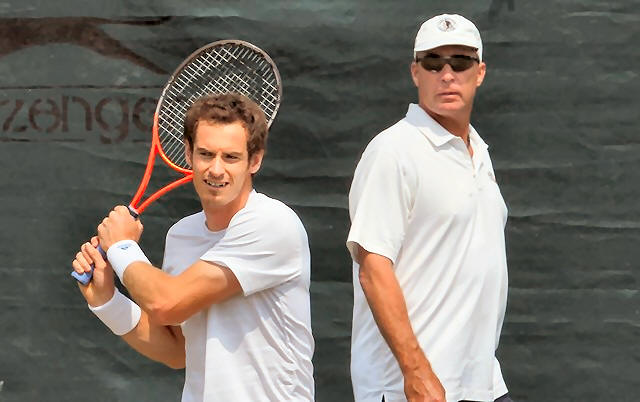 Andy Murray of Britain (L) trains with his coach Ivan Lendl on a