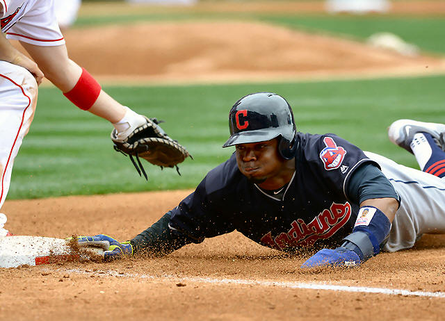 Indians designated hitter Carlos Santana (41) beats the tag back to
