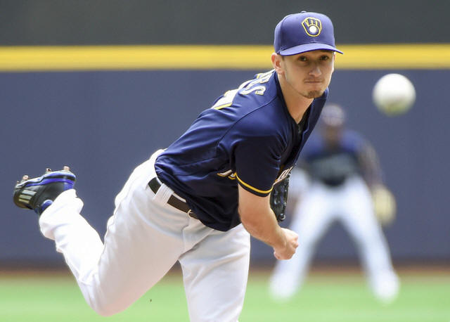 Brewers pitcher Zach Davies (27) pitches in the first inning against