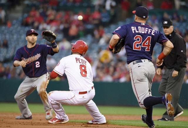 Angels shortstop Gregorio Petit (8) attempts to elude Minnesota