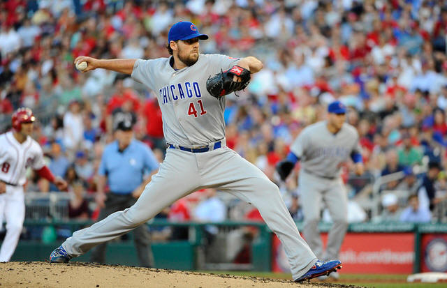 Cubs starting pitcher John Lackey (41) throws to the Washington