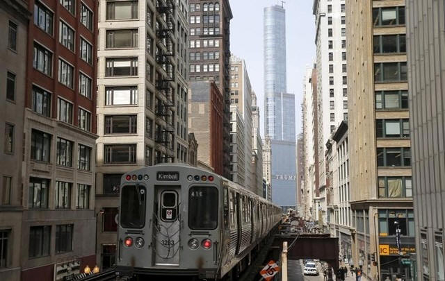 A subway car rides along the tracks towards The Trump International
