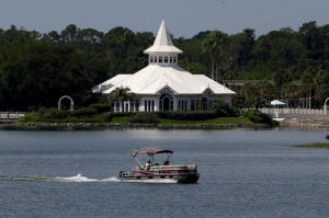 A search boat passes Disney's Fairy Tale Weddings Chapel in the