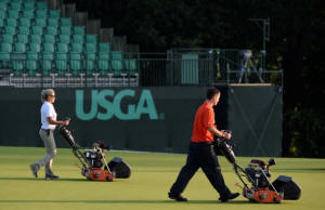 Workers prepare the greens before the first round of the U.S. Open
